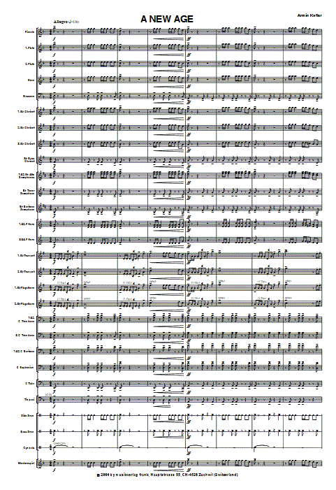 Additional info/contents Armin Kofler's "A New Age" is a masterful composition for wind orchestra that impresses with its clear structure, variety of musical expressions and emotional depth. The changing tempos and moods of the five movements offer both musicians and listeners a rich and captivating musical experience. "A New Age" is a significant work that has the potential to become a permanent part of the wind orchestra repertoire.