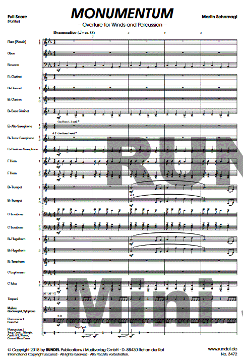 Additional info/contents The Latin term "monumentum" (monument) in music refers to works of lasting artistic significance that impress through formal rigor or symbolic expression. Martin Scharnagl's overture "Monumentum" for wind orchestra captivates with its dramatic contrasts: a "Drammatico" in E-flat major transitions to a virtuosic "Allegro" in D-flat major, before a cyclical return completes the structure. The dense instrumentation and dynamic tempo changes demand technical skill and expressive power. The title underscores the monumental character of the work—a homage to the wind band tradition enriched by modern compositional techniques.