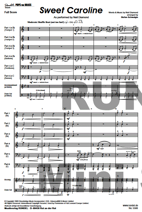 Sweet Caroline - click here Sweet Caroline (6 Blechbläser; optional; drum set; accordion; guitar; ]), full score and parts