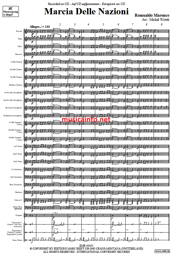 Additional info/contents *Marcia Delle Nazioni* by Romualdo Marenco is a representative example of late 19th-century marching music. Michal Worek's arrangement for intermediate wind orchestras and brass bands ensures that this work remains accessible and relevant today. By combining historical authenticity with contemporary playability, the arrangement makes an important contribution to the maintenance and dissemination of the marching repertoire in the brass music scene.