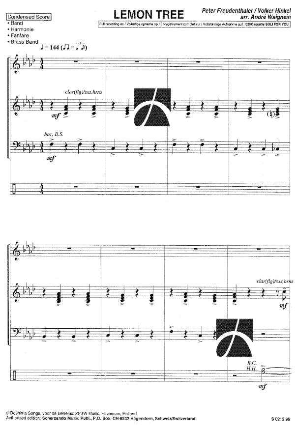 Lemon Tree - click here Lemon Tree (concert/wind band; or; fanfare band), Condensed Score and parts 99.99