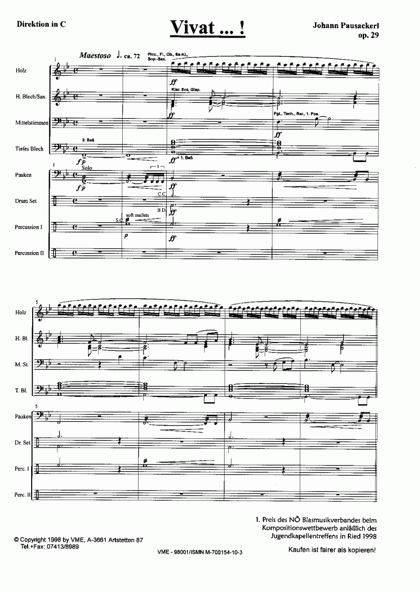 Additional info/contents The impetus for this work was a composition competition organized by the Lower Austrian Brass Band Association (NÖBV). The competition sought both a representative piece for the NÖBV to commemorate the 40th anniversary of the Austrian Brass Band Association in 1998, and a required piece for the Austrian Youth Band Festival in Ried im Innkreis that same year. "Vivat …!" was selected by the expert jury as one of the two winning entries and subsequently became the required piece for the Youth Band Festival in Ried.